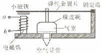 8.人们常常用充气泵为鱼缸内的水补充氧气,如图是一种剥用电磁原理制作的充气泵的结构示意图,其工作原理类似打点计时器。当电流从电磁铁的接线柱a流入,吸引小磁铁向下运动时,以下选项中正确的是 ( )