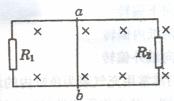 如图所示,导体ab长l=0.5m,放在B=0.4T的匀强磁场中,磁场方向垂直线框在平面向里,电阻R1=2Ω,R2=4Ω,导体ab以及其他连接电路的导线电阻均忽略不计·现使ab以3m/s的速度向右匀速运动,求