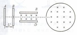 25.如图所示,带电量为+q、质量为m的离子(不计重力)由静止开始经A、B间电压加速以后,沿中心线射入带电金属板C、D间,C、D间电压为Uo,板间距离为d,中间有垂直于纸面向里的匀强磁场,磁感应强度为B0。