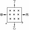 如图所示,正方形金属线框四条边电阻均相等,有理想边界的匀强磁场垂直线框平面且刚好充满整个线框,今以相同的速率分别沿甲、乙、丙、丁四个方向将线框拉出磁场,使a、b两点间电势差最大的拉出方向是