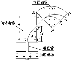 13.(19分)如图,离子源A产生的初速为零、带电量均为e、质量不同的正离子被电压为U0的加速电场加速后匀速通过准直管,垂直射入匀强偏转电场,偏转后通过极板HM上的小孔S离开电场,经过一段匀速直线运动,垂直于边界MN进入磁感应强度为B的匀强磁场。已知HO=d,HS=2d,