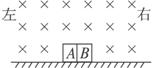 23.(12分)如图所示,在垂直于纸面向里的匀强磁场中,水平面上有两个并排放置的小滑块A、B,它们的质量分别为mA和mB,两滑块与水平面的动摩擦因数均为μ.滑块A、B均带有负电荷,电荷量大小分别为qA和qB,不考虑两滑块间相互作用的静电力.在A、B之间有少量炸药,某时刻炸药突然爆炸,炸后滑块A沿水平面以速度v0向左匀速运动,滑块B沿水平面向右滑动.炸药爆炸的过程时间很短,忽略不计.