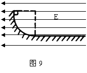 (10分)如图9所示,质量为0.2kg的物体带电量为4×10-4C,从半径为0.3m的光滑的1/4圆弧滑轨上端由静止下滑到底端,然后继续沿水平面滑动。物体与水平面间的滑动摩擦系数为0.4,整个装置处于水平向左E=103N/C的匀强电场中,求(1)物体运动到圆弧最底端的速度大小;(2)物体在水平面上滑行的最大距离。