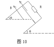 (12分)如图10所示,两平行金属导轨之间的距离为L=0.6m,两导轨所在平面与水平面之间的夹角为θ=37°,电阻R的阻值为1Ω(其余部分电阻不计),一质量为m=0.1kg的导体棒横放在导轨上,整个装置处于匀强磁场中,磁感强度为B=0.5T,方向垂直导轨平面斜向上,已知导体棒与金属导轨间的动摩擦因数为μ=0.3,今由静止释放导体棒,导体棒沿导轨下滑S=3m后,开始做匀速直线运动。已知