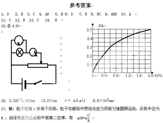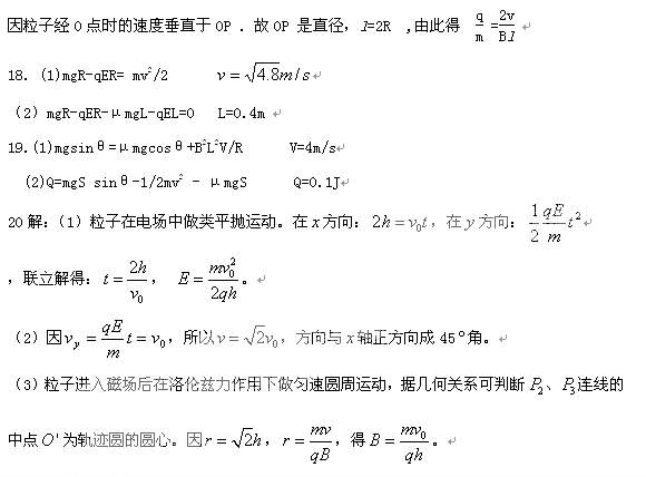 17.(8分)图8中MN表示真空中垂直于纸面的平板,它的一侧有匀强磁场,磁场的方向垂直于纸面向里,磁感应强度大小为B,一带电粒子从平板上的狭缝O处以垂直于平板的初速度v射入磁场区域,最后到达平板上的P点,已知B,v以及P到O的距离L,不计重力,求此粒子的电荷q与质量m之比.