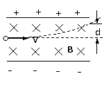 一带电量为+q,质量为m的粒子由静止经加速电场(加速电压为U)加速后,垂直进入相互垂直的匀强电场和匀强磁场,电场E方向竖直向下,磁场方向垂直纸面向里,测出该粒子离开场区时的速度大小为V(不计重力),运动轨迹如图。求粒子离开场区时偏离原方向的距离d。