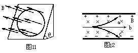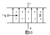 16.如图10所示,质量为m,带电量为+q的粒子,从两平行电极板正中央垂直电场线和磁感线以速度v飞入.已知两板间距为d,磁感强度为B,这时粒子恰能直线穿过电场和磁场区域(重力不计).今将磁感强度增大到某值,则粒子将落到极板上.当粒子落到极板上时的动能为______.