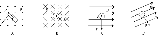 将四根通电直导线分别放在下图所示的四个匀强磁场中,图中给出了匀强磁场B的方向、导线中电流I的方向,某同学在图中画出了通电直导线所受磁场力F的方向,其中正确的是( )