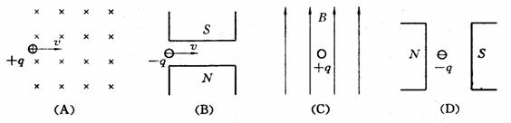 23、如图所示,各带电粒子均以速度v射入匀强磁场,其中图C中v的方向垂直纸面向里,图D中v的方向垂直纸面向外,试分别指出各带电粒子所受洛仑兹力的方向。