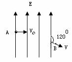 附加题(30分)如图所示,质量为200g的带电微粒,带电量为0.2C,从A点以2m/s的速度v0垂直射入竖直平面内的匀强电场中,场强E=200N/C,从B点射出电场时的速度方向与电场线成1200角,则A、B两点的电势差是多少?(g取10m/s2)