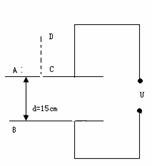 (16分)如图所示,质量m=3×10-6g的油滴带有负电荷q=8.5×10-11c,从离c缺口正上方的20cm的D处静止自由落下,若要使油滴不落在B板上,A、B板间至少应该加多大的电压?那个板的电势高?(g取10m/s2)