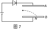 如图7所示,平行板电容器AB两极板水平放置,A在上方,B在下方,现将其和二极管串联接在电源上,已知A和电源正极相连,二极管具有单向导电性,一带电小球沿AB 中心水平射入,打在B极板上的N点,小球的重力不能忽略,现通过上下移动A板来改变两极板AB间距(两极板仍平行),则下列说法正确的是
