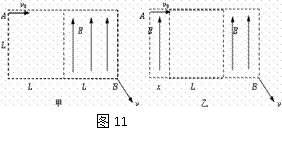 13.如图11所示,在长为2L、宽为L的区域内有正好一半空间有场强为E、方向平行于短边的匀强电场,有一个质量为m,电量为e的电子,以平行于长边的速度v0从区域的左上角A点射入该区域,不计电子所受重力,要使这个电子能从区域的右下角的B点射出,求: