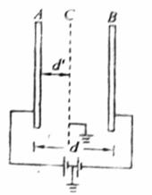 如图所示,两平行金属板A、B相距d=3m,接在电压U=12V的电池组上,两板间形成匀强电场,电池组的中点接地。