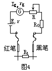 图4为多用表欧姆挡的原理示意图,其中电流表的满偏电流为300μA,内阻rg=100Ω,调零电阻的最大值R=50kΩ,串联的固定电阻R0=50Ω,电池电动势E=1.5V,用它测量电阻Rx,能准确测量的阻值范围是 [ ]