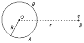 为Q,点电荷B带电量为q.B与A球间的距离为r. 当B不存在而只有A存在且达到静电平衡状态时,电荷Q在球心O处的电场强度等于________.当点电荷B也同时存在并达到静电平衡时,球心O处的电场强度等于________,金属球上的电荷在球心O处产生的场强的大小等于________.