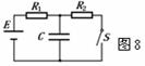 10.如图8所示,E=10V,R1=4Ω,R2=6Ω,C=30μF,电池内阻不计。先将开关S闭合,稳定后再将S断开,S断开后通过R1的电荷量为
