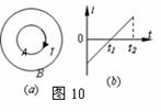 如图10(a)所示,两个闭合圆形线圈A、B的圆心重合,放在同一水平面内,线圈A中通以如图10(b)所示的变化电流,t=0时电流方向为顺时针(箭头所示)。在t1-t2时间内,对于线圈B,下列说法正确的是