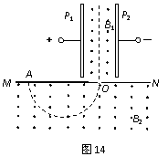 如图14所示,两平行金属板P1和P2之间的距离为d、电压为U,板间存在磁感应强度为B1的匀强磁场. 一个带正电的粒子在两板间沿虚线所示路径做匀速直线运动. 粒子通过两平行板后从O点进入另一磁感应强度为B2的匀强磁场中,在洛伦兹力的作用下,粒子做匀速圆周运动,经过半个圆周后打在挡板MN上的A点. 已知粒子的质量为m,电荷量为q.