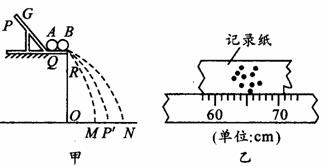 5.某同学用图甲所示装置通过半径相同的A、B两球的碰撞来寻找碰撞中的不变量,图中PQ是斜槽,QR为水平槽,实验时先使A球从斜槽上某一固定位置C由静止开始滚下,落到位于水平地面的记录纸上,留下痕迹,重复上述操作10次,得到10个落点痕迹,再把B球放在水平槽上靠近槽末端的地方,让A球仍从位置C由静止开始滚下,和B球碰撞后,A、B球分别在记录纸上留下各自的落点痕迹,重复这种操作10次,图中O是水平槽末端口在记录纸上的垂直投影点,P,为未放被碰小球B时A球的平均落点,M为与B球碰后A球的平均落点,N为被碰球B的平均落点.若B球落点痕迹如图乙所示,其中米尺水平放置,且平行于OP,,米尺的零点与O点对齐.(注意MA>MB)