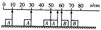 8.A、B两滑块在同一光滑的水平直导轨上相向运动发生碰撞(碰撞时间极短)。用闪光照相,闪光4次摄得的闪光照片如下图所示。已知闪光的时间间隔为Δt,而闪光本身持续时间极短,在这4次闪光的瞬间,A、B两滑块均在0-80cm刻度范围内,且第一次闪光时,滑块A恰好通过x=55cm处,滑块B恰好通过x=70cm处,问: