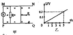 (10分)如图甲所示,光滑且足够长的平行金属导轨MN、PQ固定在同一水平面上,两导轨间距L=0.2m,电阻R=0.4Ω,导轨上停放一质量为m=0.1kg、电阻r=0.1Ω的金属杆,导轨电阻可忽略不计,整个装置处于磁感度强度B=0.5T的匀强磁场中,磁场方向垂直纸面向里,现用一外力F沿水平方向拉杆,使之由静止开始运动,若理想电压表的示数U随时间t变化的关系如图乙所示. 求: