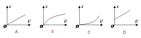 如图所示,一个静止的质量为m,带电量为+q的带电粒子(不计重力),经电压U加速后垂直进入磁感应强度为B的匀强磁场中,粒子打至P点,设OP=x,能正确反映x与U之间函数关系的x-U图如图中的( )