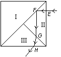 如图所示,有三块截面为等腰直角三角形的透明材料(图中I、II、III)恰好拼成一个正方形棱镜. 从E点垂直于边射入的单色光在F处发生全反射,在G、H连续发生两次折射后射出. 若该单色光在三块材料中的传播速率依次为v1、v2、v3,下列关系式中正确的是……………….. ( )