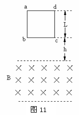 15、(10分)如图11所示,一个质量为m=0.01kg,边长L=0.1m,电阻R=0.4Ω的正方形导体线框abcd,从高h=0.8m的高处由静止自由下落,下落时线框平面始终在竖直平面内,且保持与水平磁场方向垂直,当线框下边bc刚一进入下方的有界匀强磁场时,恰好做匀速运动(g=10m/s