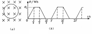 (10分)一电阻为R的金属圆环,放在匀强磁场中,磁场与圆环所在平面垂直,如图(a)所示.已知通过圆环的磁通量随时间t的变化关系如图(b)所示,图中的最大磁通量φ0和变化周期T 都是已知量,求