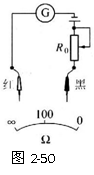 欧姆表电路及刻度盘如图2-50所示,现因表头损坏,换用一个新表头.甲表头满偏电流为原来表头的2倍,内阻与原表头相同;乙表头满偏电流与原表头相同,内阻为原表头的2倍,则换用甲表头和换用乙表头后刻度盘的中值电阻分别为( )