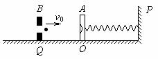 18.(10分)如图所示,质量M=0.040kg的靶盒A静止在光滑水平导轨上的O点,水平轻质弹簧一端栓在固定挡板P上,另一端与靶盒A连接。Q处有一固定的发射器B,它可以瞄准靶盒发射一颗水平速度为v0=50m/s,质量m=0.010kg的弹丸,当弹丸打入靶盒A后,便留在盒内,碰撞时间极短。不计空气阻力。求