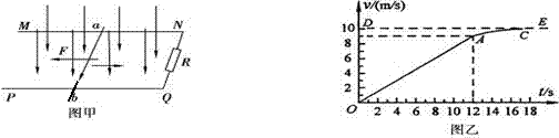 21.(9分)如图甲所示,空间存在B=0.5T,方向竖直向下的匀强磁场,MN、PQ是相互平行的粗糙的长直导轨,处于同一水平面内,其间距L=0.2m,R是连在导轨一端的电阻,ab是跨接在导轨上质量m=0.1kg的导体棒,从零时刻开始,通过一小型电动机对ab棒施加一个牵引力F,方向水平向左,使其从静止开始沿导轨做加速=运动,此过程中棒始终保持与导轨垂直且接触良好,图乙是棒的速度一时间图象,其中OA段是直线,AC是曲线,DE是曲线图象的渐近线小型电动机在12s末达到额定功率P=4.5W,此后功率保持不变。除R以外,其余部分的电阻均不计,g=10 m/s2。