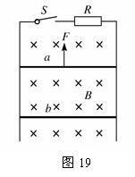23、如图19所示,在磁感应强度为B的水平方向的匀强磁场中竖直放置两平行导轨,磁场方向与导轨所在平面垂直。导轨上端跨接一阻值为R的电阻(导轨电阻不计)。两金属棒a和b的电阻均为R,质量分别为ma=2×10-2Kg和mb=1×10-2Kg,它们与导轨相连,并可沿导轨无摩擦滑动。闭合开关S,先固定b,用一恒力F向上拉a,稳定后a以v1=10m/s的速度匀速运动,此时再释放b,b恰好能保持静止,设导轨足够长,取g=10m/s2。