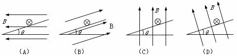 10.质量为m的金属导体棒置于倾角为θ的导轨上,当导体棒通以垂直纸面向里的电流时,恰能在导轨上静止。如图所示的四个图中,标出了四种匀强磁场的方向,其中棒与导轨间的摩擦力可能为零的是( )