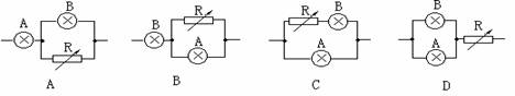 6.有两只额定电压都是110V的灯泡A和B,A的额定功率是100W,B的额定功率是40W,为了使它们接在220V的电路上能正常发光,用图中哪个连接方法最合理?( A )