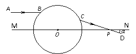 26.如图,MN是一条通过透明球体球心的直线。在真空中波长为λ0=564nm的单色细光束AB平行于MN射向球体,B为入射点,若出射光线CD与MN的交点P到球心O的距离是球半径的