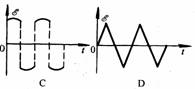 4. 如图所示,大小相等的匀强磁场分布在直角坐标系的四个象限里,相邻象限的磁感强度B的方向相反,均垂直于纸面,现在一闭合扇形线框OABO,以角速度ω绕Oz轴在xOy平面内匀速转动,那么在它旋转一周的过程中(从图中所示位置开始计时),线框内感应电动势与时间的关系图线是: