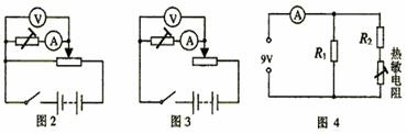 (2)在图4电路中,电源电压恒为9V,电流表读数为70mA,定值电阻R1=250Ω。由热敏电阻的I-U关系曲线(如图1所示)可知,热敏电阻两端的电压为 V;电阻R2的阻值为 Ω。(每空2分)