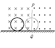 10. 在光滑的水平地面上方,有两个磁感应强度大小均为B,方向相反的水平匀强磁场,如图PQ为两个磁场的边界,磁场范围足够大。一个半径为a,质量为m,电阻为R的金属圆环垂直磁场方向,以速度v从如图位置运动,当圆环运动到直径刚好与边界线PQ重合时,圆环的速度为v/2,则下列说法正确的是 ( )