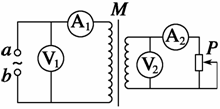 如图所示,M为理想变压器,电表均可视为理想表,接线柱a、b接电压u=311sin314t(V)的正弦交流电源。当滑动变阻器的滑片P向上滑动时,示数发生变化的电表是 ( )