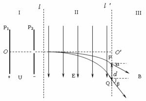 的Q点离开区域II,此时速度与水平方向夹角β=60o 。已知PQ两点的距离为d。