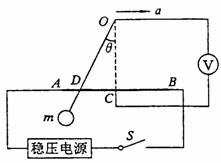 16.(11分)如图所示是一种悬球式加速度仪,它可以用来测定沿水平轨道运动的列车的加速度,金属球的质量为m,它系在金属球的下端,金属丝的上端悬挂在O点,AB是一根长为L的均匀电阻丝,其阻值为R,金属丝与电阻丝接触良好,摩擦不计。电阻丝的中点C焊接一根导线,从O点也引出一根导线,两线之间接入一个电压表V(金属丝和导线电阻不计)。图中虚线OC与AB垂直,且OC=h。电阻丝AB接在电压为U的直流稳压电源上,整个装置固定在列车中且AB沿着车前进的方向,列车静止时金属丝呈坚直状态,当列车加速或前进时,金属丝将偏离竖直方向,从电压表V的读数变化可以测出加速度的大小。