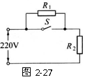 2.电饭锅工作时有两种状态:一种是锅内水烧干前的加热状态,另一种是锅内水烧干后的保温状态.如图2-27所示是电饭锅电路的示意图,S是用感温材料制造的开关,R1是电阻,R2是供加热用的电阻丝.