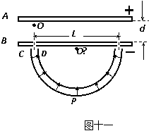 14.(10分)如图十一所示,A、B为两块平行金属薄板,A板带正电、B板带负电。两板之间存在着匀强电场,两板间距为d、电势差为U,在B板上开有两个间距为L的小孔。C、D为两块同心半圆形金属板,圆心都在贴近B板的O’处,C带正电、D带负电。半圆形金属板两板间的距离很近,且末端的中心线正对着B板上的小孔,两板间的电场强度可认为大小处处相等,方向都指向O’。半圆形金属板两端与B板的间隙可忽略不计。现从正对B板小孔紧靠A板的O处由静止释放一个质量为m、电量为q的带正电微粒(微粒重力不计),问: