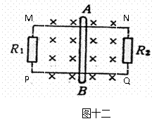 15.(12分)如十二所示,MN、PQ为光滑金属导轨(金属导轨电阻忽略不计),MN、PQ相距L=50cm,导体棒AB在两轨道间的电阻为r=1Ω,且可以在MN、PQ上滑动,定值电阻R1=3Ω,R2=6Ω,整个装置放在磁感应强度为B=1.0T的匀强磁场中,磁场方向垂直于整个导轨平面,现用外力F拉着AB棒向右以v=5m/s速度作匀速运动。