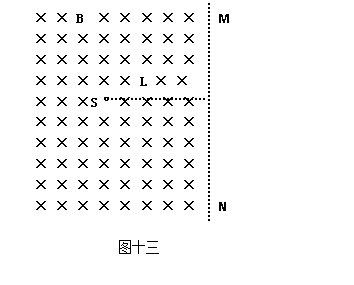 16.(10分)如图十三磁场边界为MN(垂直纸面的一个平面)。在磁场区域内有一点电子源S,向四面八方均匀地,持续不断地发射电子。这里仅考察电子源所在的纸面平面内由点子源发射的电子,并设电子源离界面MN的垂直距离为L。已知电子质量为m,电子带电量为e。