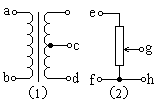 (1).(2)两电路中,当a.b两端与e.f两端分别加上220伏的交流电压时,测得c.d间与g.h间的电压均为 110伏。若分别在c.d两端与g.h两端加上110伏的交流电压,则a.b间与e.f间的电压分别为