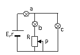 如图所示,电路中a、b、c三只小灯泡均发光。当把变阻器R的滑动片P向下滑动时,三只灯