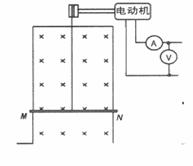 20.如图所示,电动机牵引一根原来静止的、长L为1m、质量m为0.1kg的导体棒MN上升,导体棒的电阻R为1Ω,架在竖直放置的框架上,它们处于磁感应强度B为1T的匀强磁场中,磁场方向与框架平面垂直。当导体棒上升h=3.8m时,获得稳定的速度,此过程中导体棒上产生的热量为2J,电动机牵引棒时,电压表、电流表的读数分别为7V、1A,电动机内阻r为1Ω,不计框架电阻及一切摩擦,求: